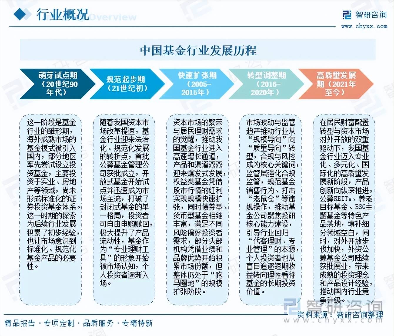我国基金行业的发展是一部从试点探索到规范成熟、从封闭单一到开放多元的演进史,与中国资本市场改革深度绑定,可划分为萌芽试点期、规范起步期、快速扩张期、转型调整期、高质量发展期五个核心阶段,近年来,在居民财富配置转型与资本市场对外开放的双重驱动下,我国基金行业迈入专业化、多元化、国际化的高质量发展新阶段,产品创新向纵深推进,公募REITs、养老目标基金、ESG主题基金等特色产品落地,填补细分领域空白,同时,对外开放步伐加快,外资公募基金公司陆续获批展业,带来成熟的投资理念和产品设计经验,推动国内行业竞争升级,此外,行业竞争格局重塑,马太效应加剧,头部基金公司凭借投研、品牌、渠道优势持续扩大规模,中小基金公司则通过聚焦量化投资、细分赛道等差异化策略寻求突围。
